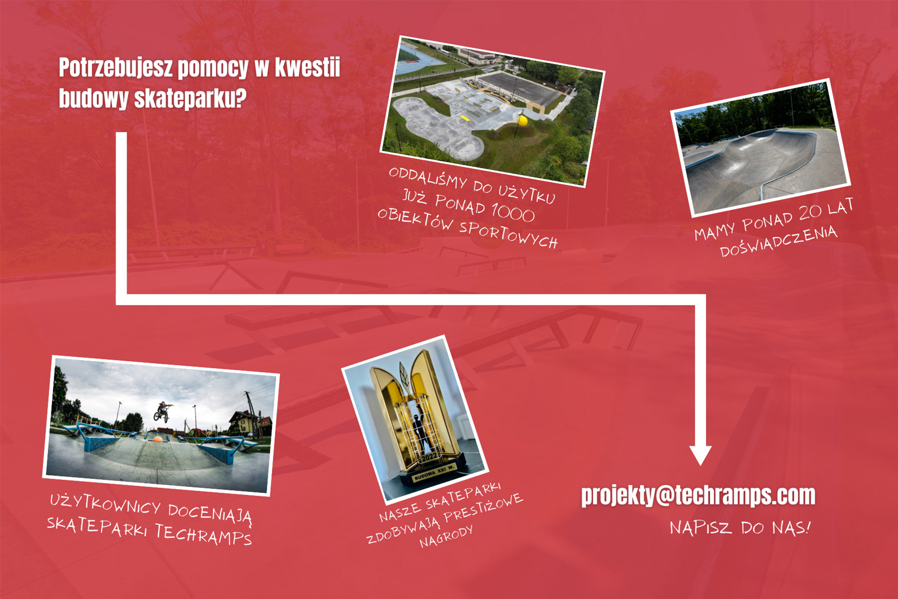 Wir entwerfen und bauen seit über 22 Jahren Beton-Skateparks, modulare Skateparks, Pumptracks und Flowparks in Polen und international. Jede Anlage, die Techramps baut, ist das Ergebnis der Leidenschaft und Erfahrung von Menschen, die diese Kultur wirklich lieben.